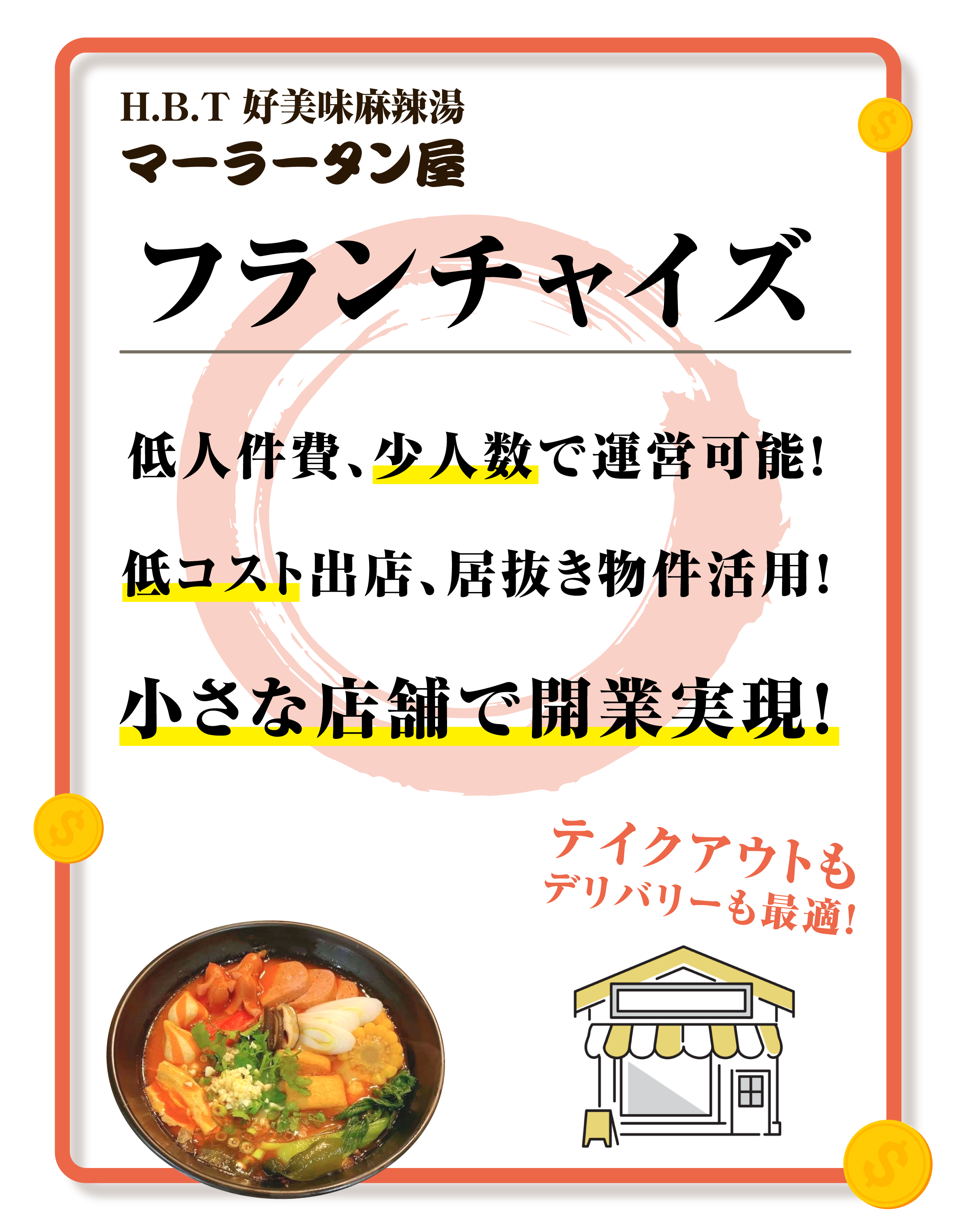 H.B.T好美味麻辣湯(マーラータン屋)のフランチャイズは、 低リスクで効率的にマーラータン店を開業できる ビジネスモデルです。